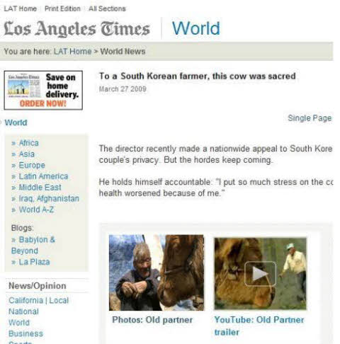 이 밖에도 LA타임즈는 봉화군 현지에서 찍은 최 할아버지 부부의 모습을 인터넷에 게재해 '워낭소리'에 대한 특별한 관심을 나타냈다.